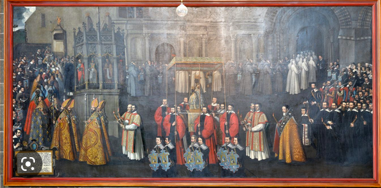 Questo dipinto raffigura la processione che ebbe luogo il 22 aprile 1630 per celebrare la fine dell'epidemia di peste (che causò 10.000 vittime a Le Puy). Questo dipinto ha un significato ancora più profondo oggi, per chi di noi ha vissuto la pandemia di Covid. Al centro, gli uomini portano la Madonna Nera e la ringraziano per la sua misericordia.
